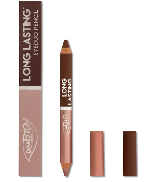 Matitone duo occhi con doppia punta nelle tonalità 103L Marrone caldo matte e Rosa satinato, pensate per creare look armoniosi che uniscono definizione e luminosità in pochi gesti.