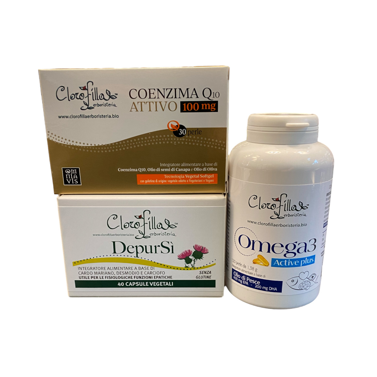 Contiene Clorofilla Omega 3 Active Plus 120 perle + Coenzima Q10 perle + Colesterol Berberina PLUS 60 capsule