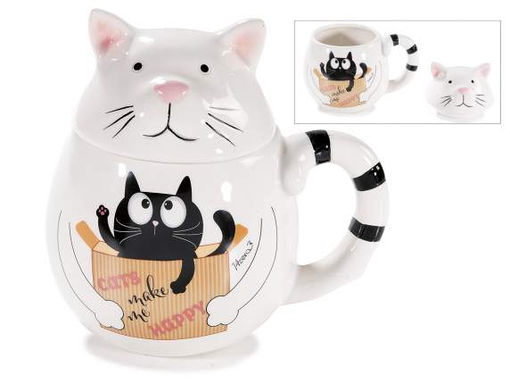 Tazze a forma di gatto in ceramica con coperchio in 3D, manico a coda e fantasia a tema.